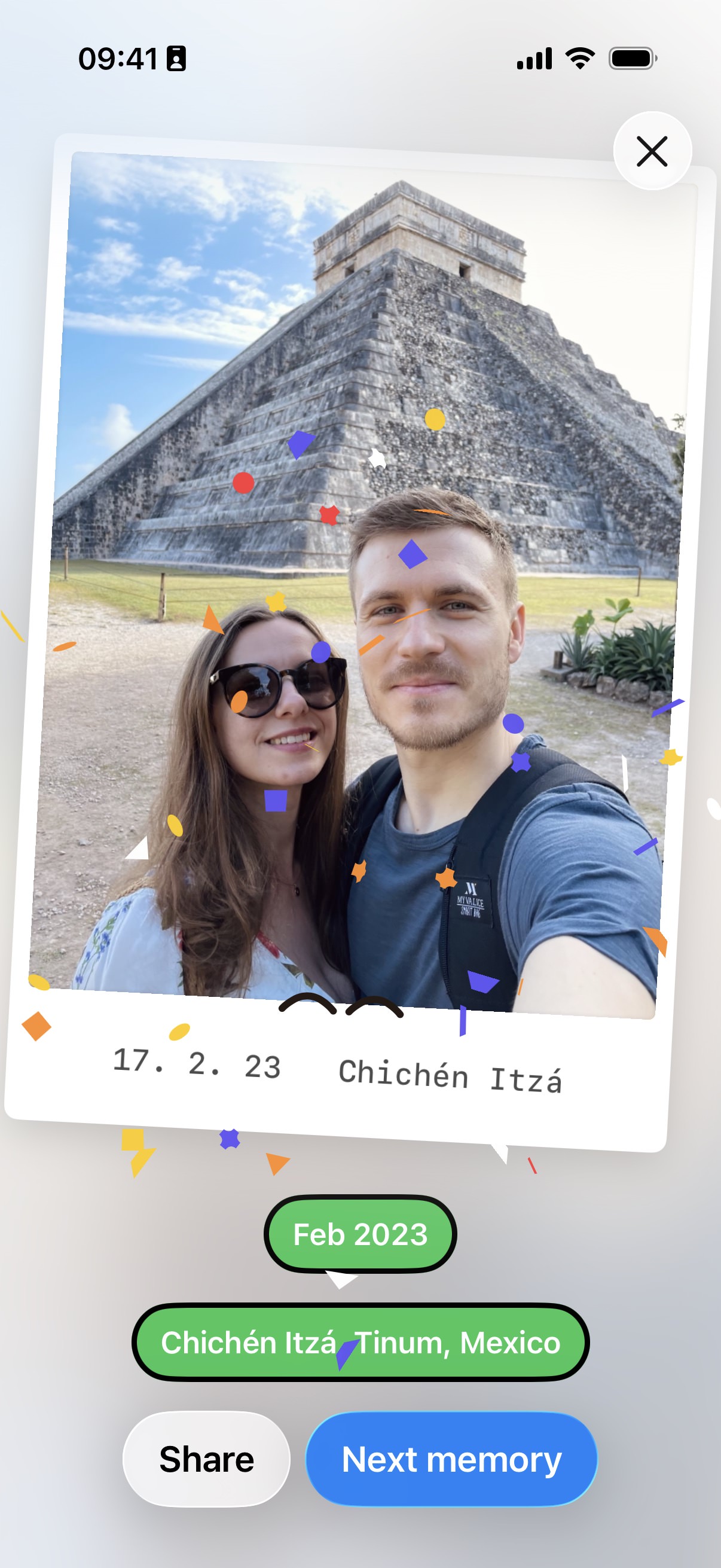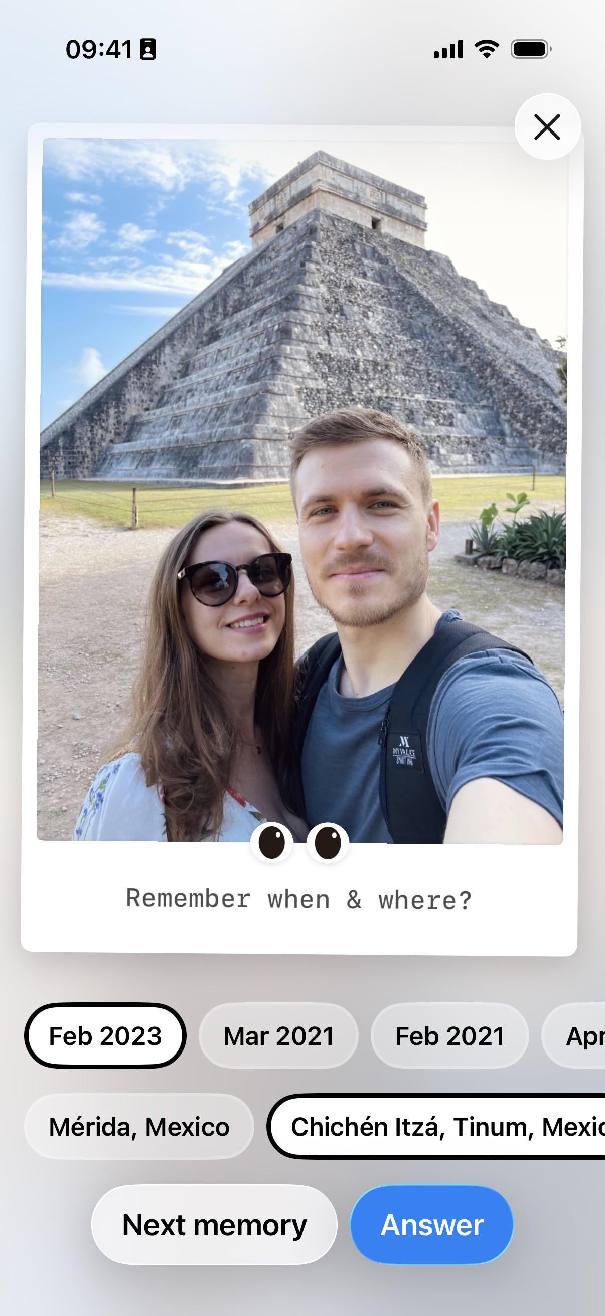 It also stays fresh because the content comes from your own camera roll. The experience changes every time, and it stays private because everything runs on-device.